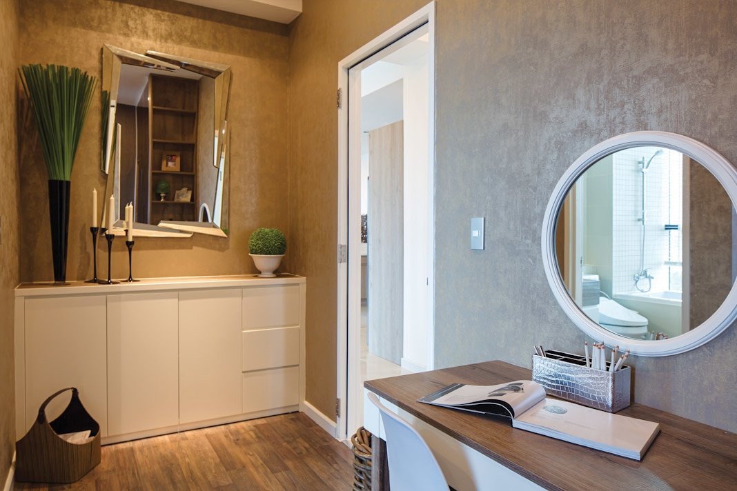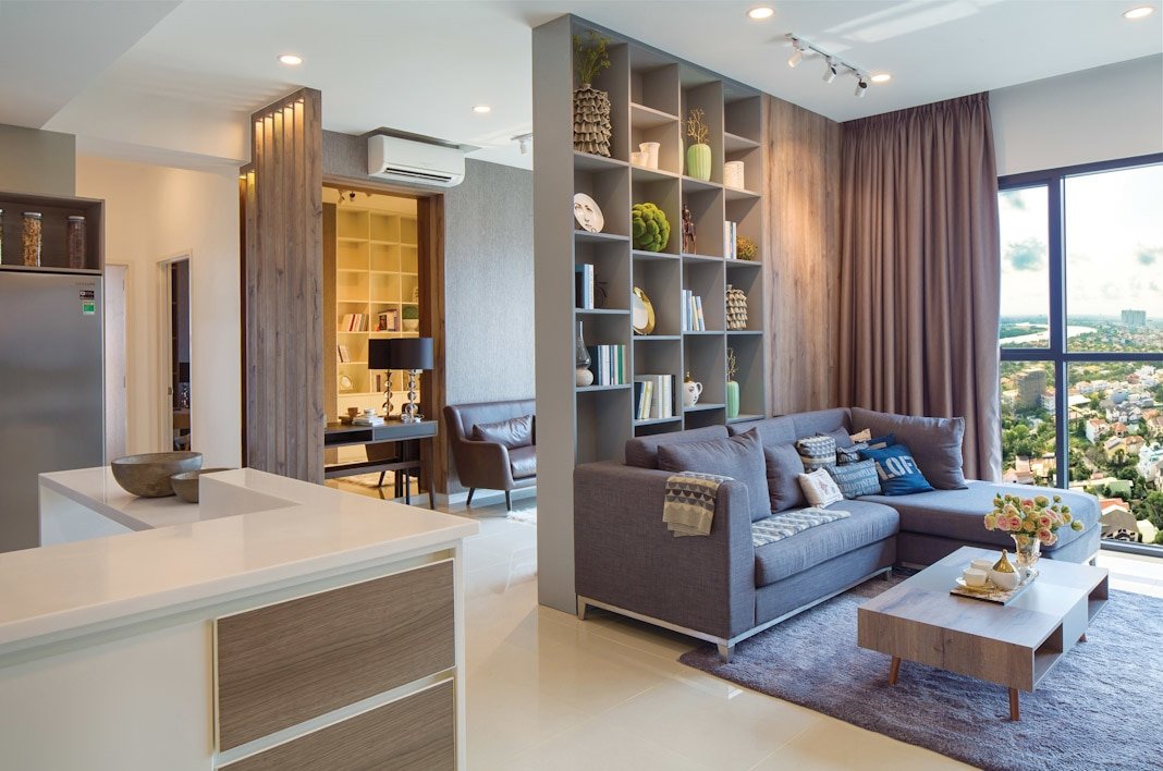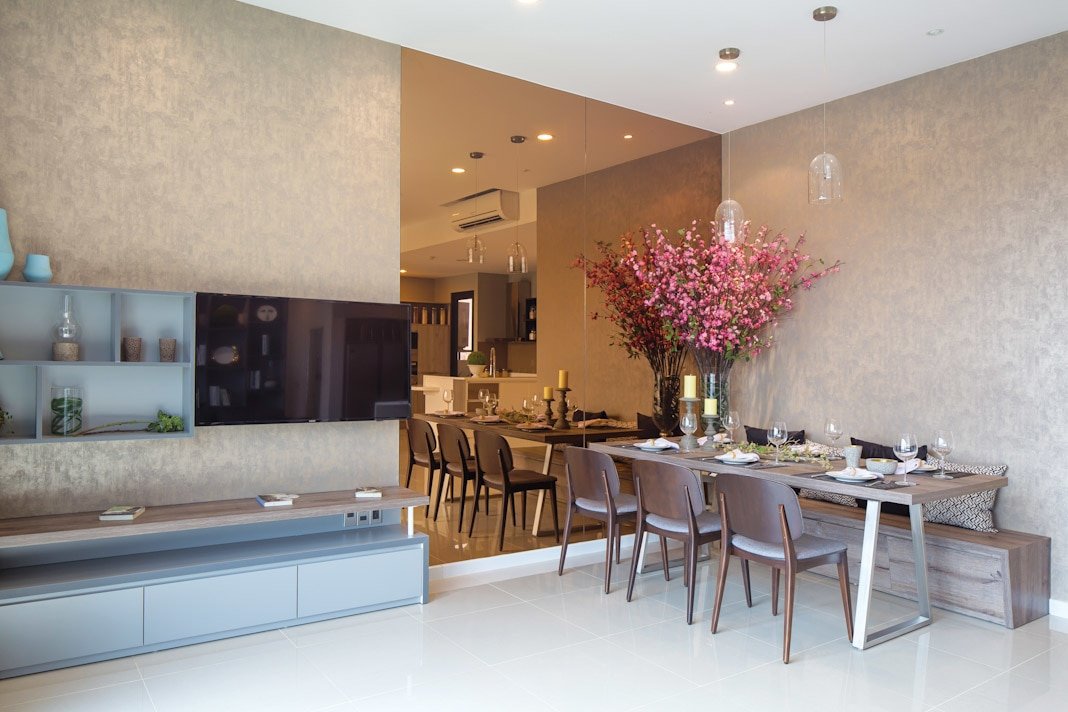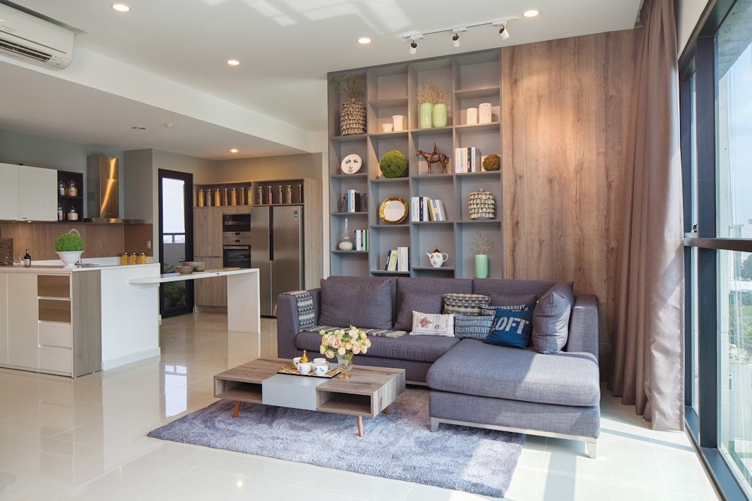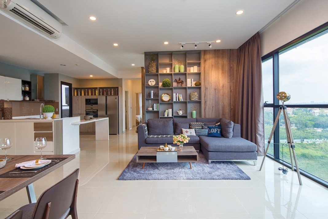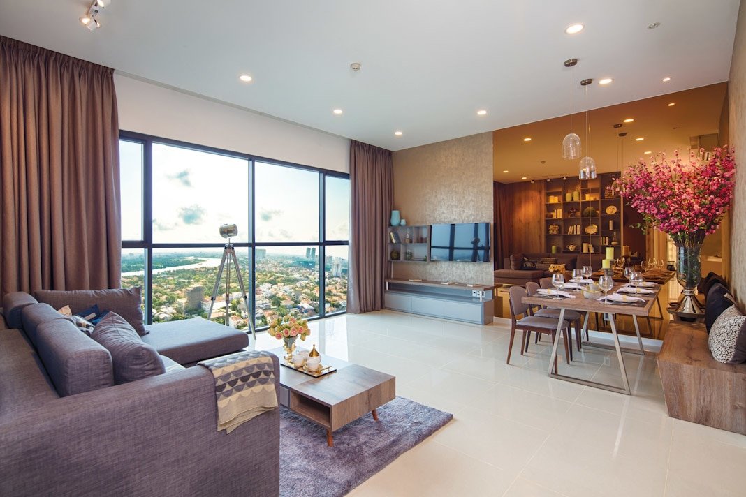Tất nhiên điều ấy còn phụ thuộc vào mức độ đầu tư thêm của chủ nhân căn hộ trong việc trang bị đồ đạc nội thất theo nhu cầu sử dụng và thẩm mỹ riêng của mình. Nhưng nhìn vào hình ảnh thực tế của căn hộ mẫu, người ta có thể tin rằng mình sẽ có được một không gian sống tốt vì đây cũng là gợi ý hết sức cụ thể và thiết thực từ những nhà thiết kế chuyên nghiệp. Căn hộ The Ascent có diện tích 99m², với quy mô hai phòng ngủ, một phòng đa năng, hai khối vệ sinh và tổ hợp không gian sinh hoạt chung là phòng khách + khu vực ăn + gian bếp. Nhìn tổng thể, căn hộ toát lên vẻ sang trọng, hiện đại và tiện nghi. Góc phòng khách nhẹ nhàng và thân thiện với sofa góc, bàn trà thấp vuông thành sắc cạnh. Màu của thảm trang trí, của vải bọc sofa và màu gỗ của kệ trang trí ở mảng tường phòng khách xuyệt tông với nhau và rất thời trang.