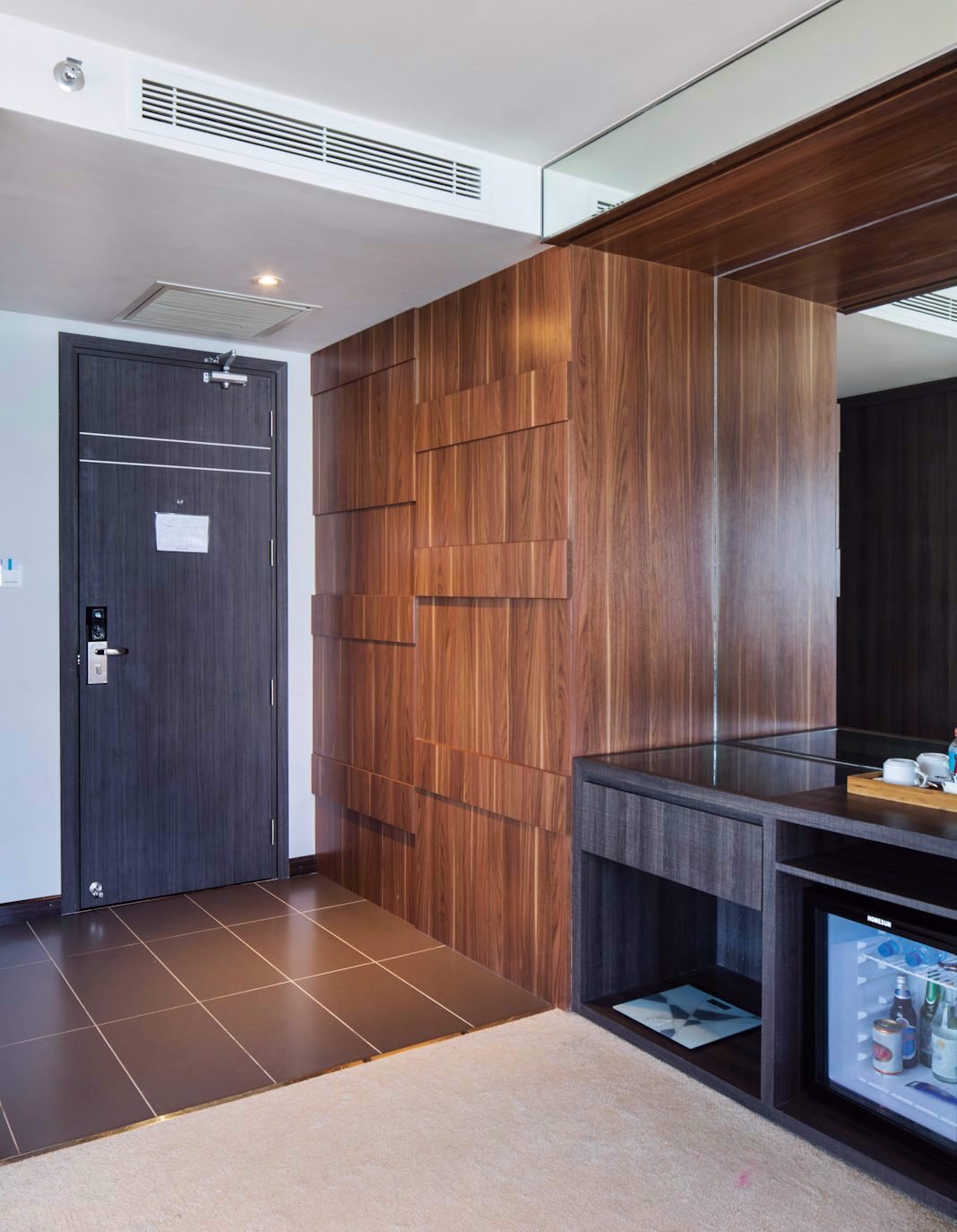 Một thiết kế hướng đến việc tiết kiệm năng lượng, sử dụng năng lượng hiệu quả thì cũng cân nhắc rất kỹ trong việc lựa chọn công nghệ phù hợp với các tiêu chí đặt ra. Ở Alana Nha Trang Beach là hệ thống điều hòa của Mitsubishi Electric. Ở đây, dàn lạnh sử dụng loại ống giấu trần nối ống gió, rất phù hợp với các không gian công cộng như sảnh lễ tân, nhà hàng, hội trường. Dàn lạnh giấu trần nối ống gió bố trí trên trần, ngụy trang dưới mảng trần gỗ, đem lại hiệu quả như mong muốn, đồng thời giữ nguyên vẻ sang trọng của không gian. Các phòng ngủ sử dụng dàn lạnh loại mỏng (200mm), phù hợp với cao độ trần của phòng ngủ, độ ồn tối đa cũng chỉ từ 28 – 36dbA. Hệ thống VRF sử dụng công nghệ biến tần toàn phần cũng góp vào việc tiết kiệm điện năng tiêu thụ. Đặc biệt, tổng chiều dài đường ống cho phép lên đến 1.000 mét. Và chênh lệch chiều cao giữa dàn nóng và dàn lạnh lên đến 90m, rất linh động trong việc lựa chọn vị trí lắp đặt dàn nóng. Ở Alana Beach, tất cả dàn nóng đều được đặt trên tầng thượng nên giảm thiểu tác động của tiếng ồn, tiết kiệm không gian và dễ dàng cho công tác bảo trì bảo dưỡng.