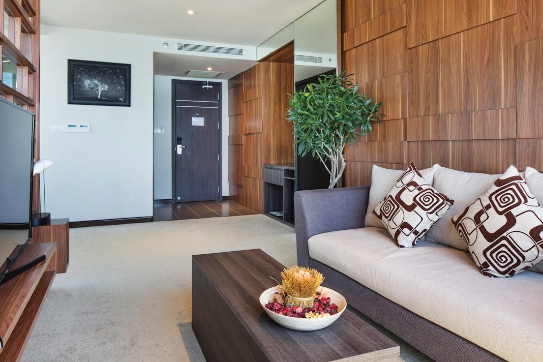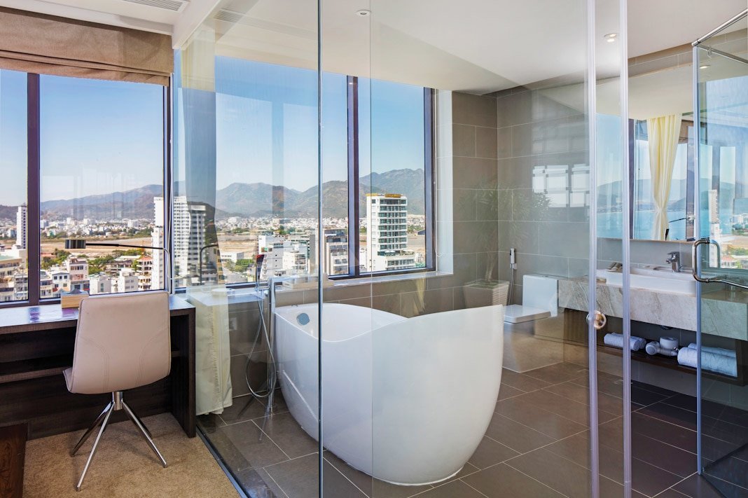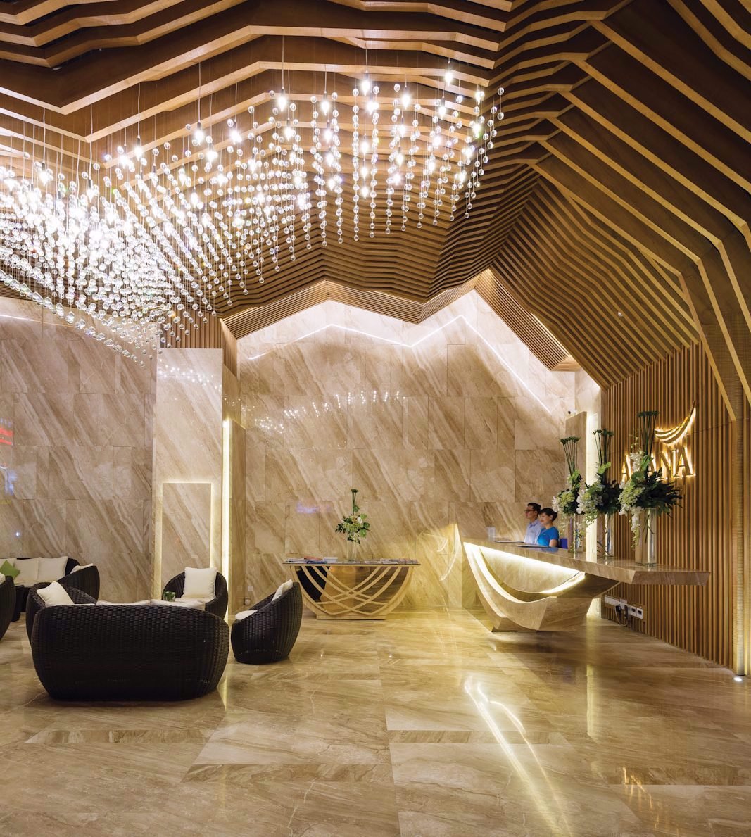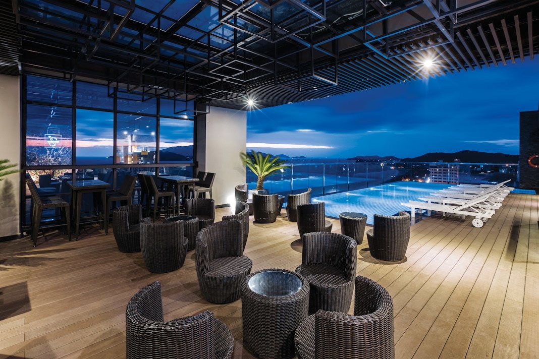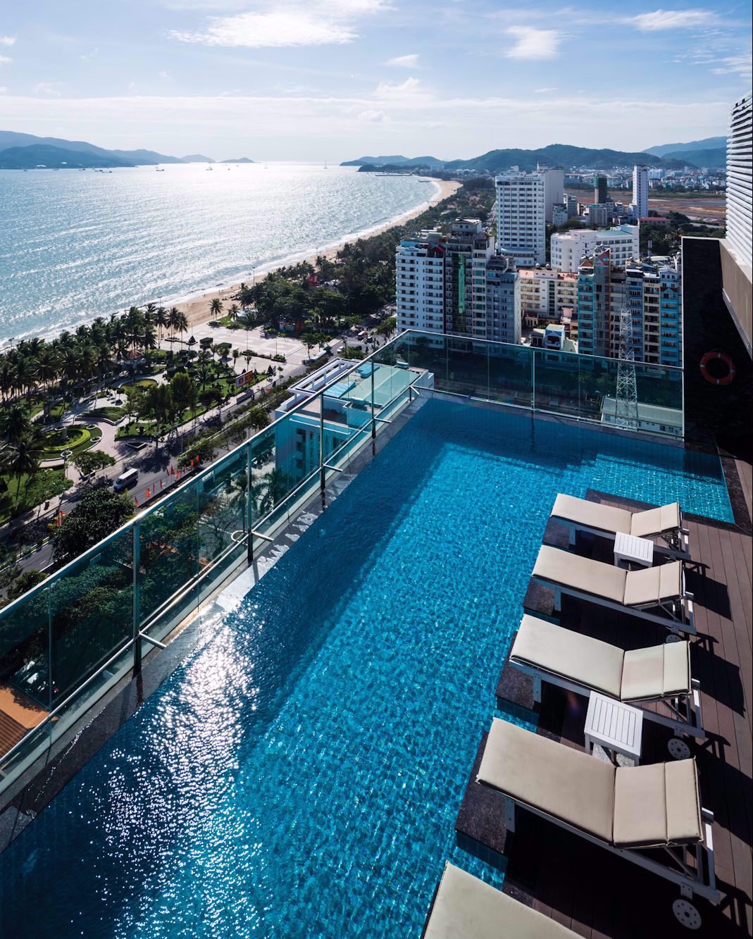 Khách sạn có quy mô 22 tầng, gồm 108 phòng các loại và nhiều không gian chức năng tiện ích khác nhằm phục vụ cho nhu cầu của du khách. Diện tích đất tại trung tâm hạn hẹp nhưng các kiến trúc sư vẫn muốn công trình có nhiều khoảng xanh. Họ giải quyết bằng cách tạo hai bức tường đứng, sử dụng cây xanh kết hợp hệ lam nhôm ở hai cánh, vừa giải quyết được ranh giới với hai nhà liền kề, vừa tạo mảng xanh cho công trình cũng như đem lại điểm nhấn ở khu vực sảnh. Do chiều sâu và chiều ngang công trình không lớn nên giải pháp đề xuất là khai thác các không gian trong và ngoài thành một khối thống nhất, vay mượn không gian của nhau, thể hiện rất rõ ở không gian sảnh chính. Ngăn cách giữa trong và ngoài chỉ là một vách kính trong suốt, các tuyến lam gỗ trên trần được phát triển và biến điệu từ trần, tường góp phần kéo giãn không gian, đồng thời tạo sự bề thế, gây ấn tượng rất lớn cho khu vực sảnh cũng như tạo sự thu hút từ bên ngoài. Với chiều rộng mặt tiền 14m, chiều sâu mở thoáng mặt là 25m, thiết kế đã xử lý để tối ưu hóa ánh sáng và thông gió tự nhiên. Trục hành lang được bố trí hợp lý để gió thông thoáng, đối lưu, giảm thiểu việc sử dụng ánh sáng nhân tạo và điều hòa không khí, góp phần tiết kiệm hao phí năng lượng trong quá trình sử dụng. Mặt tiền sử dụng các băng kính rộng, khai thác tối đa các hướng nhìn ra biển.